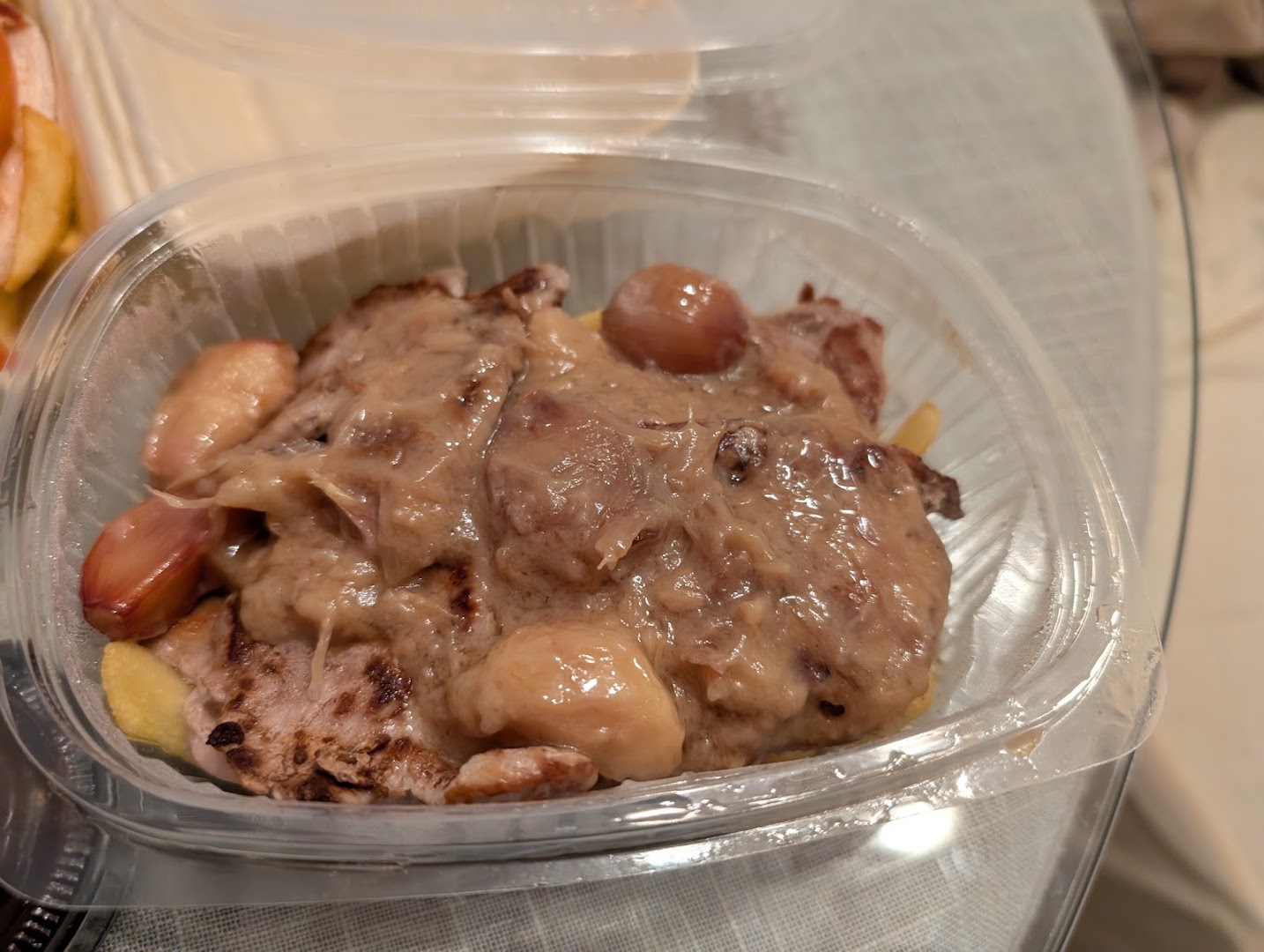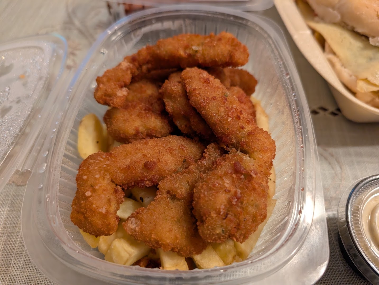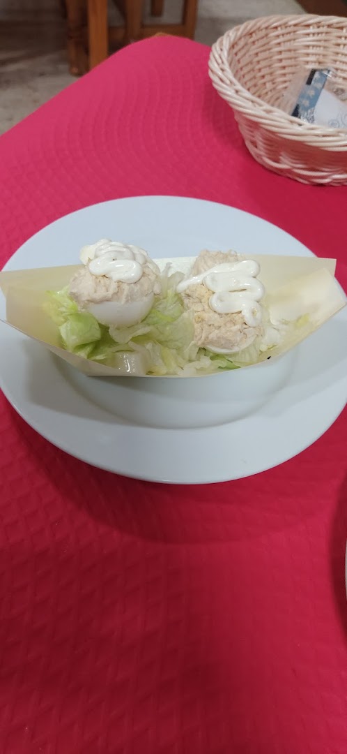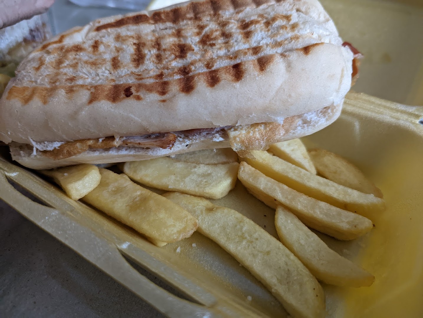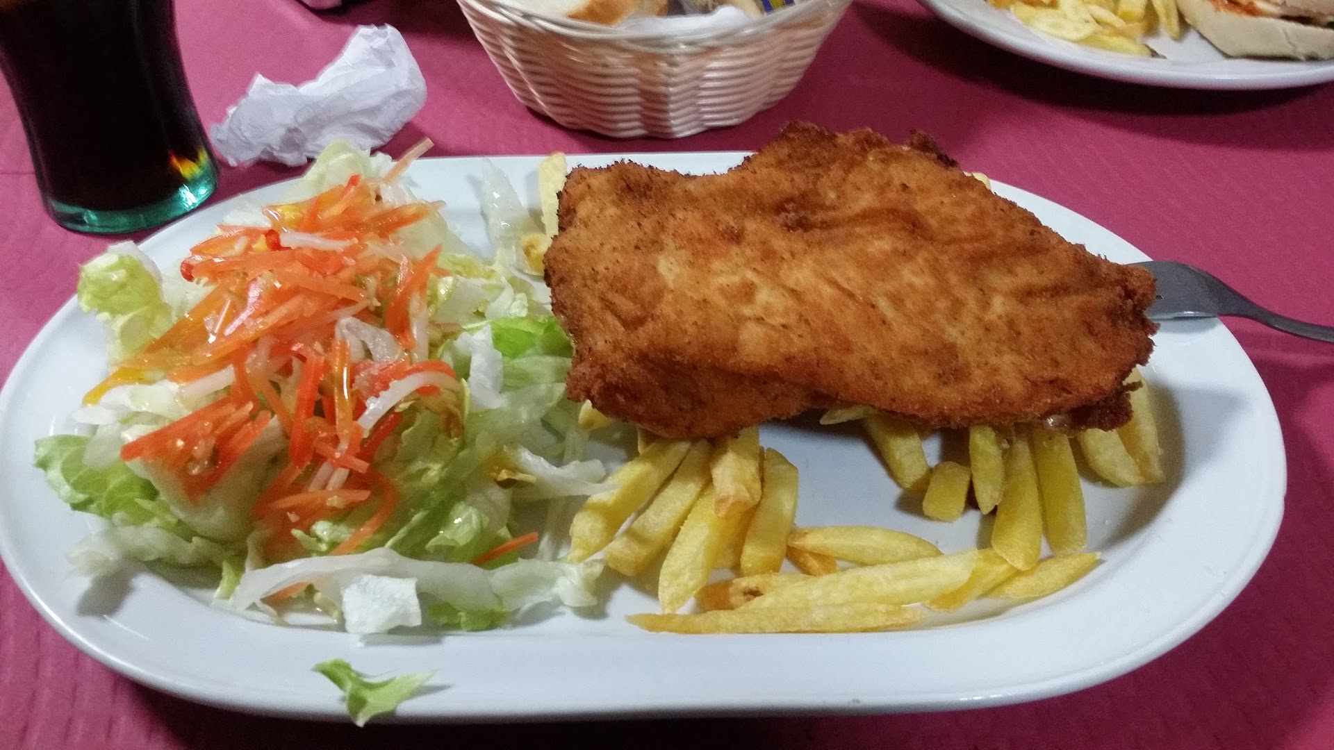 Блюдо: Sándwich Vegetal de pollo. Описание блюда: pollo, mahonesa, lechuga, tomate y huevo duro con patatas fritas.