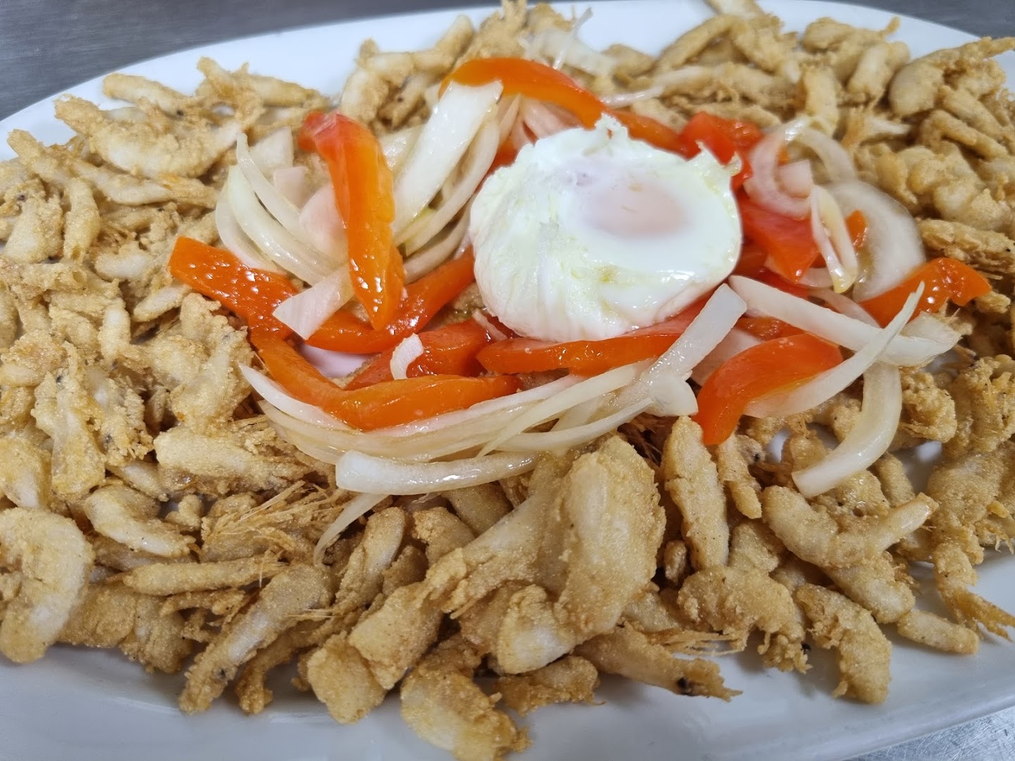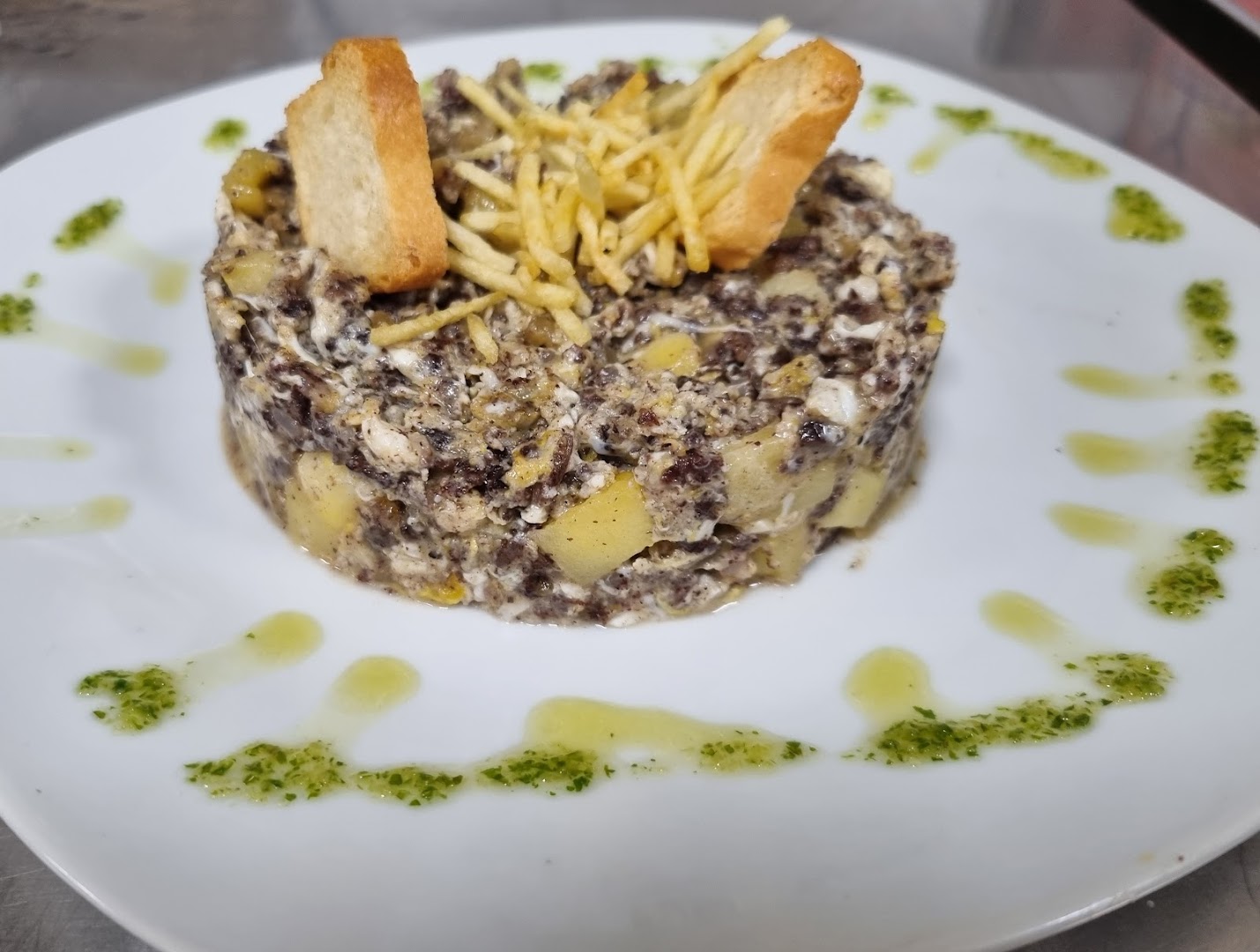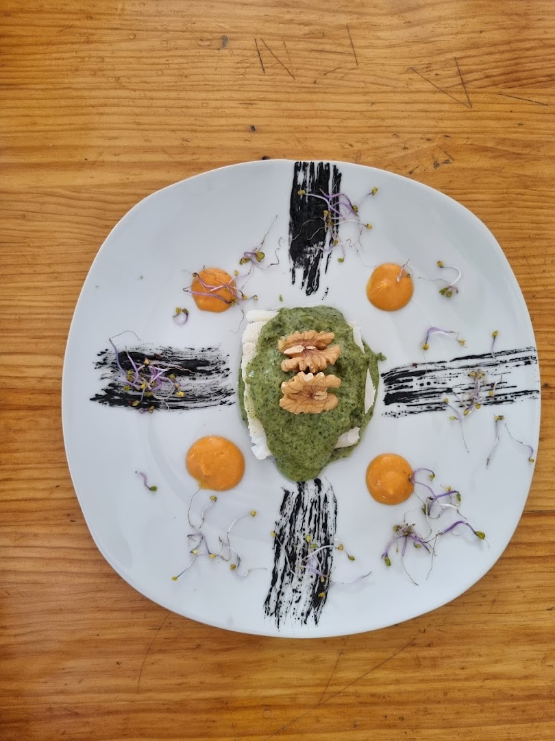Dish description: place the dish into the plate shown in the second reference image. Important: use exactly that plate and exactly the same perspective and orientation as in the reference photo.