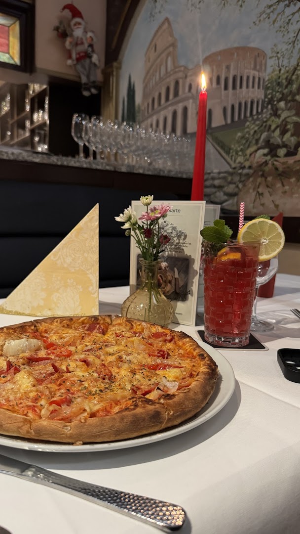 Mit Salami, Vorderschinken, Peperoniwurst, Paprika, Zwiebeln und Champignons.