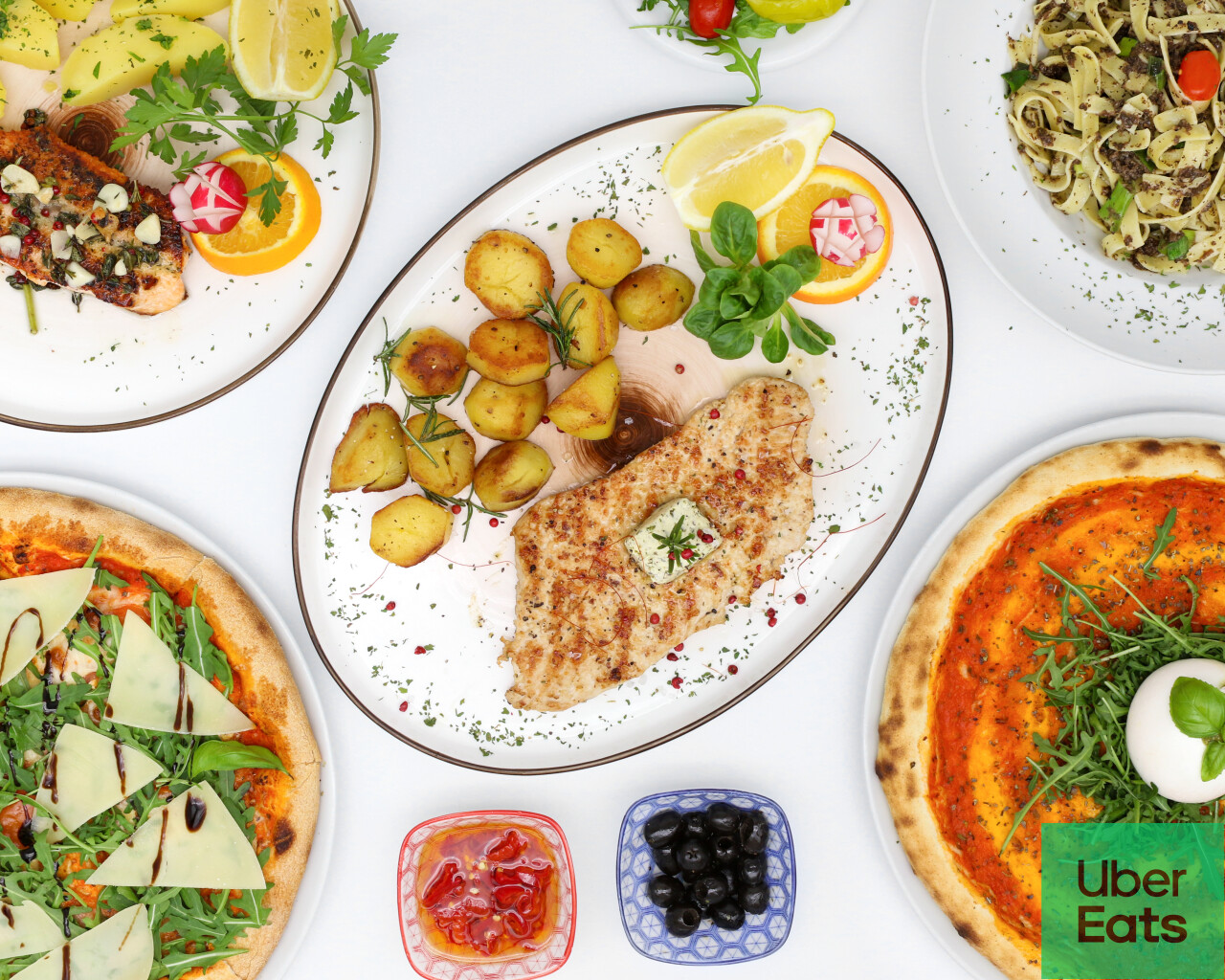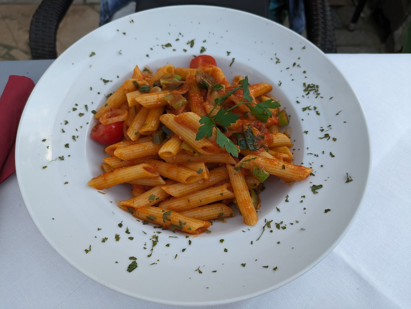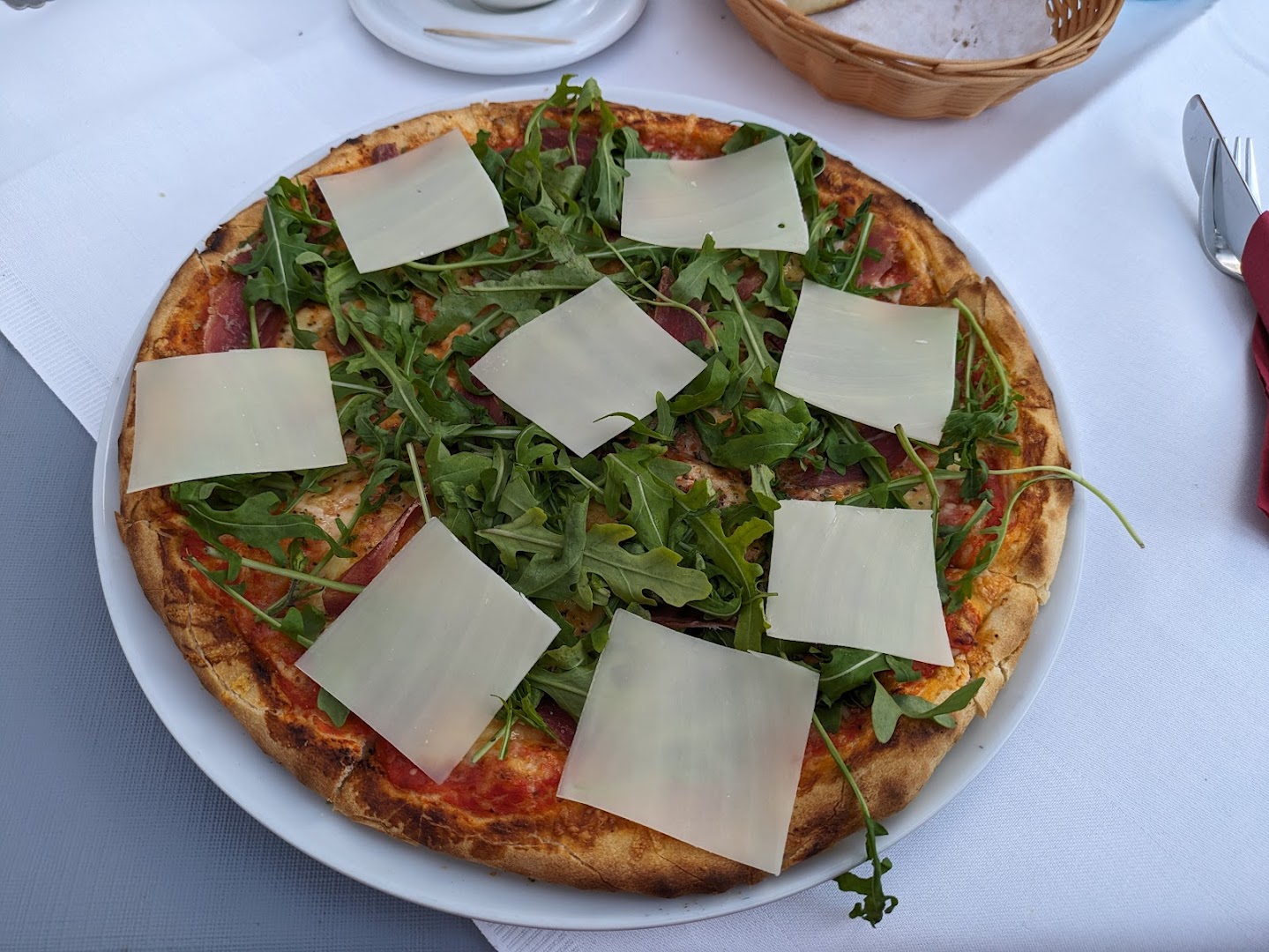 Mit Tomaten, Rucola, Zwiebeln, Peperoni und Oliven.