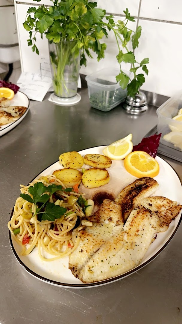 Dish description: place the dish into the plate shown in the second reference image. Important: use exactly that plate and exactly the same perspective and orientation as in the reference photo.
