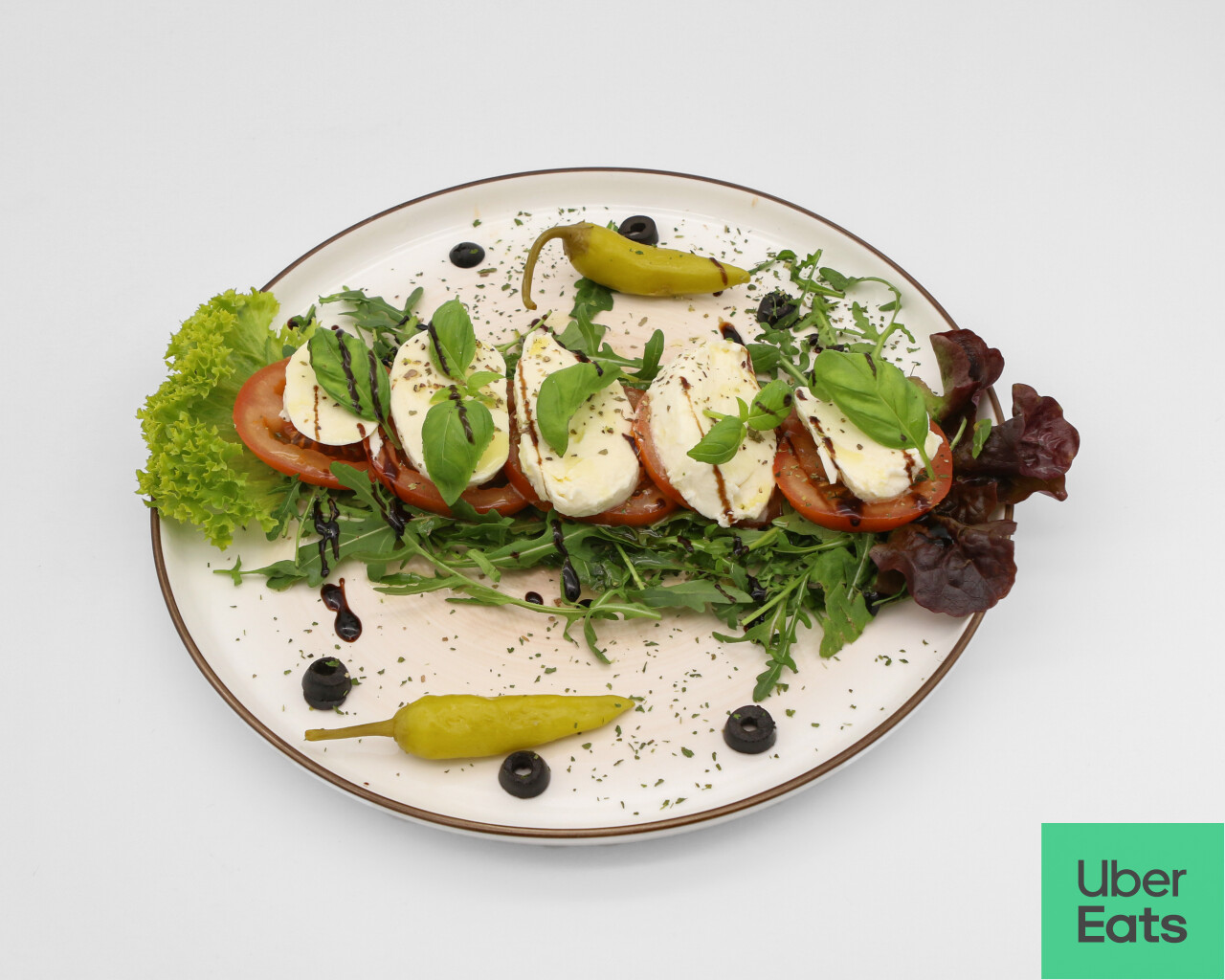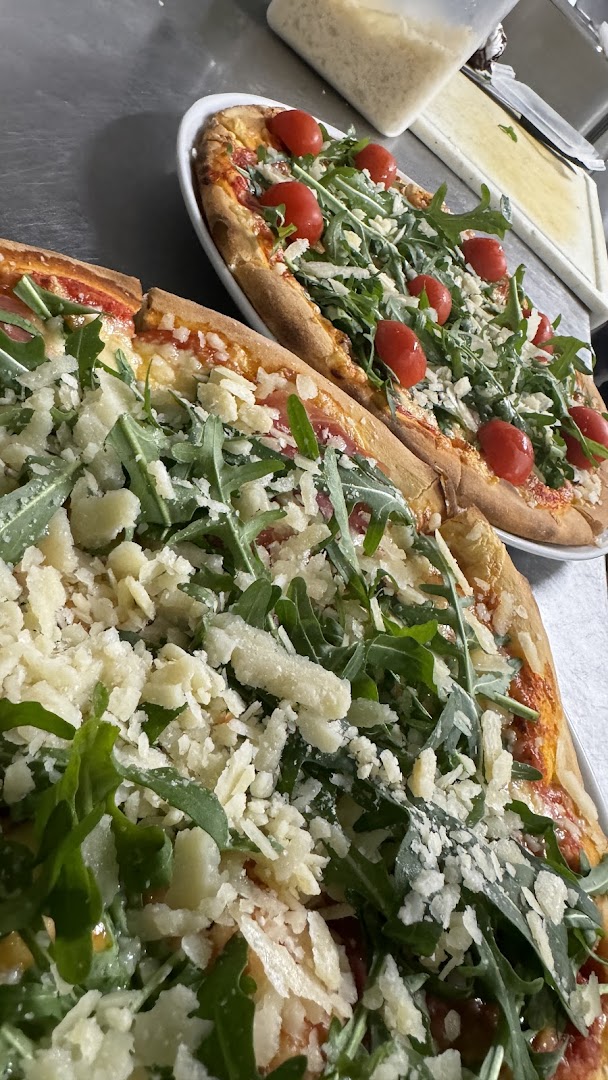 Mit frischen Tomaten, Rucola, Oliven, Zwiebeln und Peperoni.