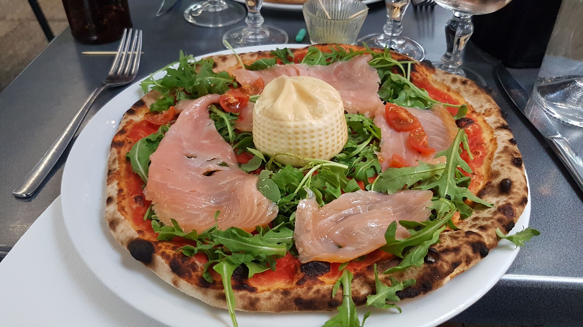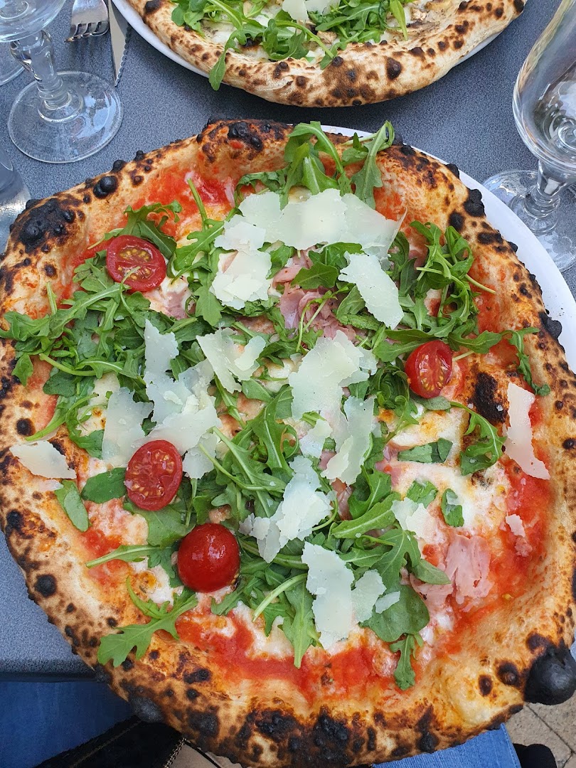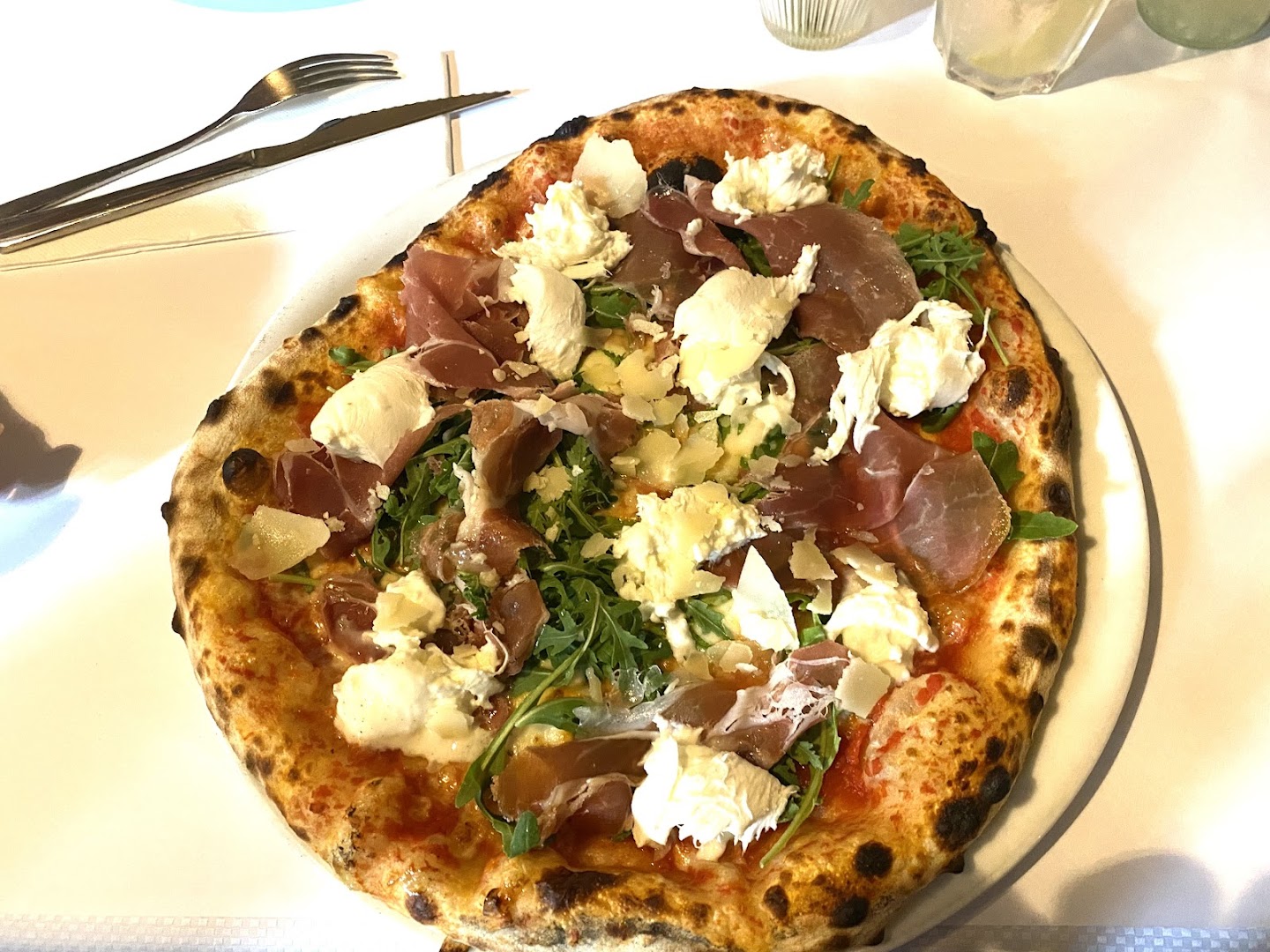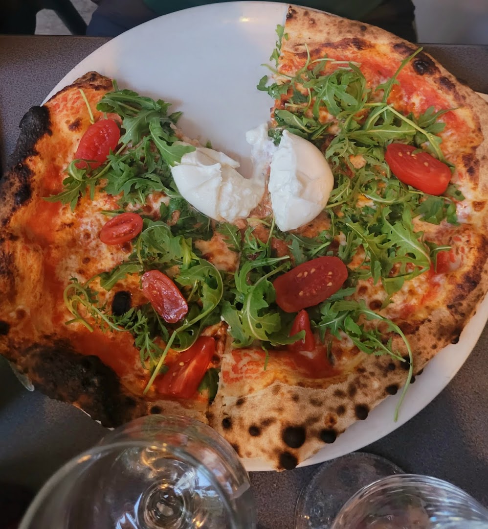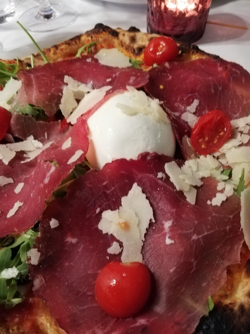 Блюдо: Pizza la pugliese. Описание блюда: Sauce tomate,fiore di latte, aubergines, poivrons, roquette, breseola "bœuf sèche", burrata, Grana Padano et huile d'olive.