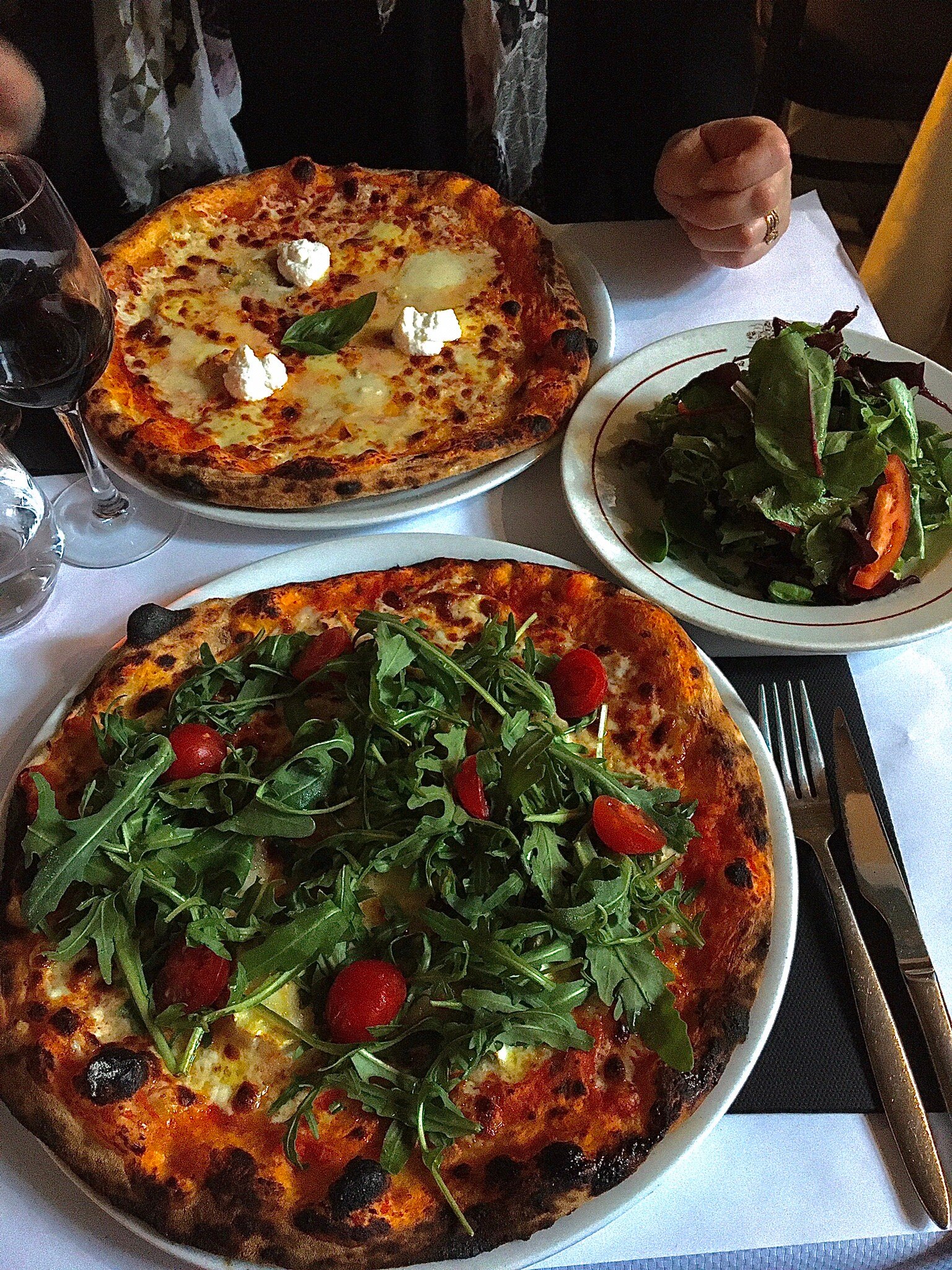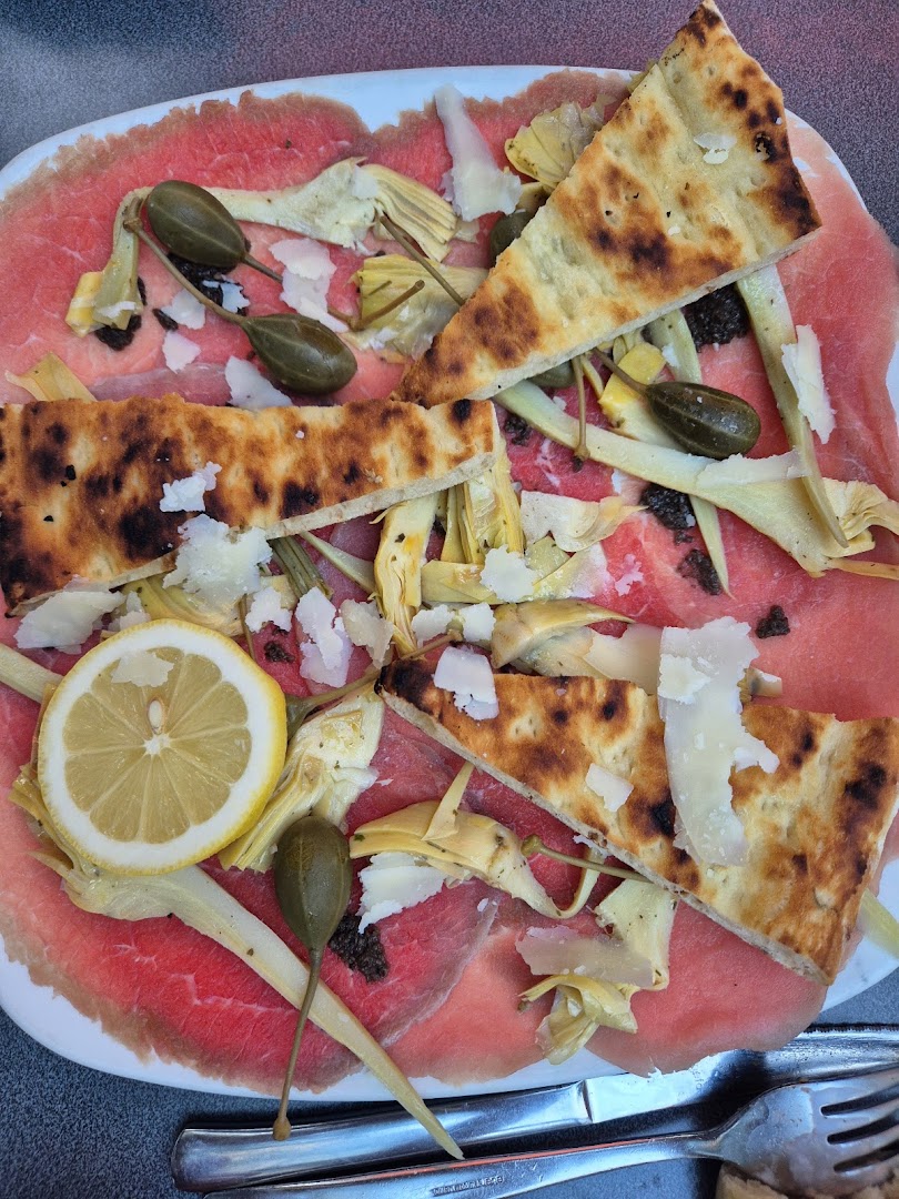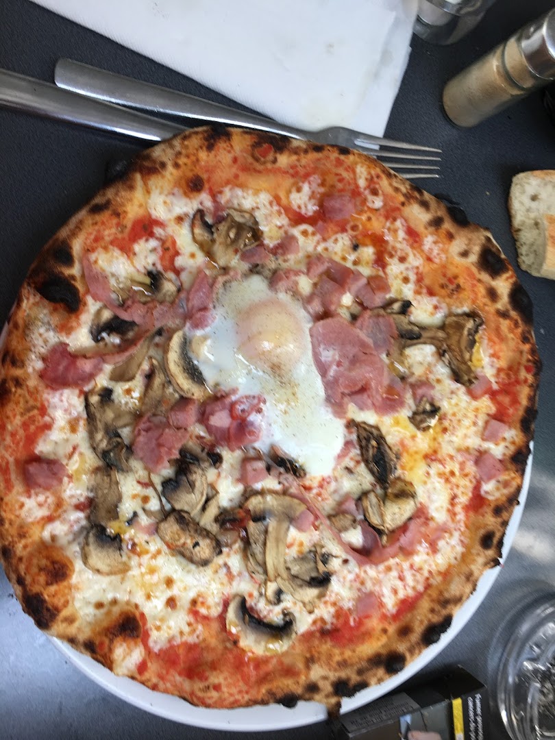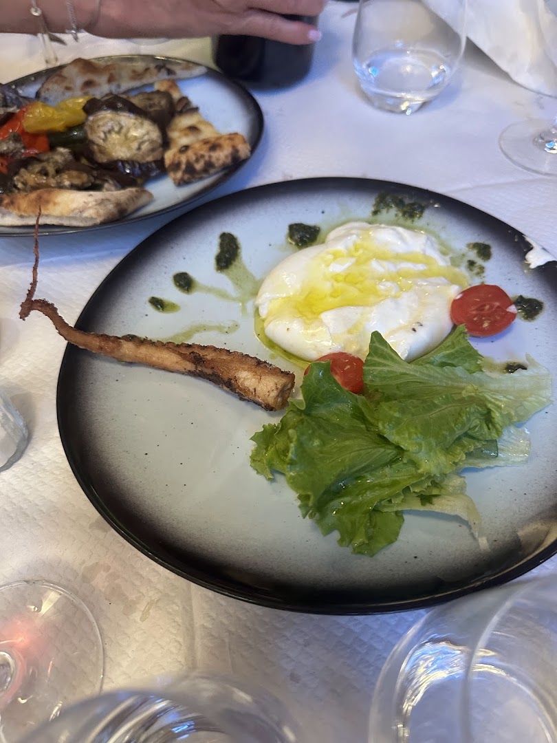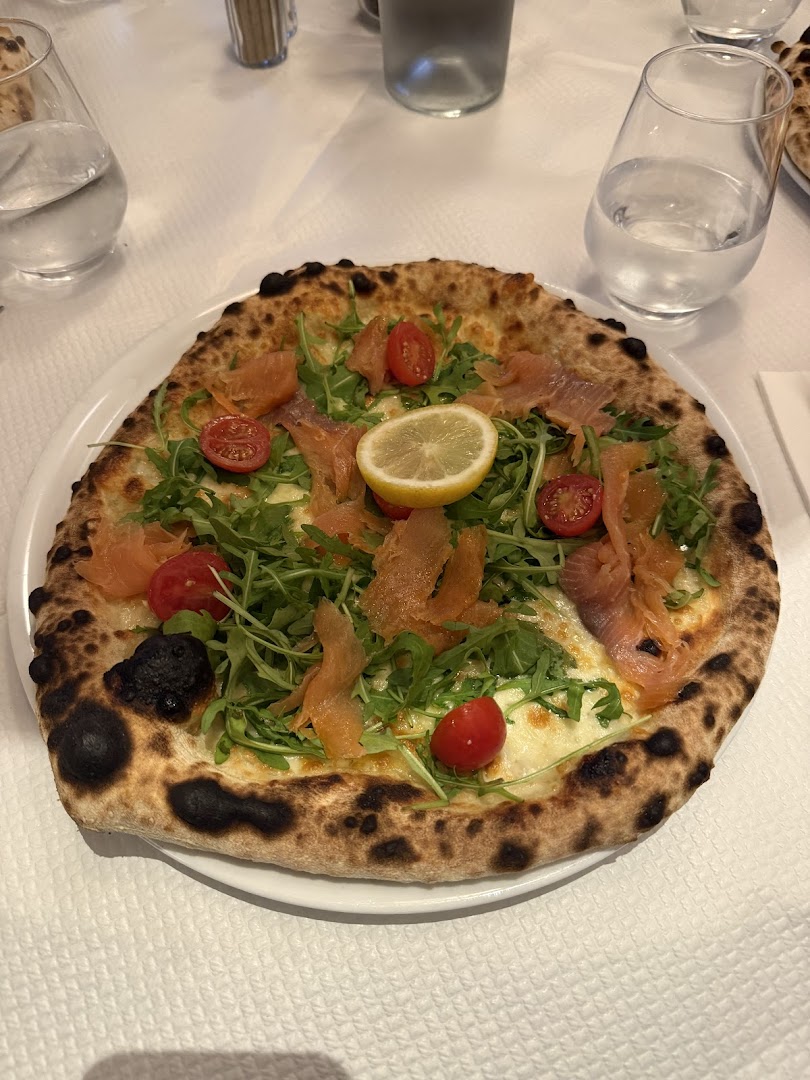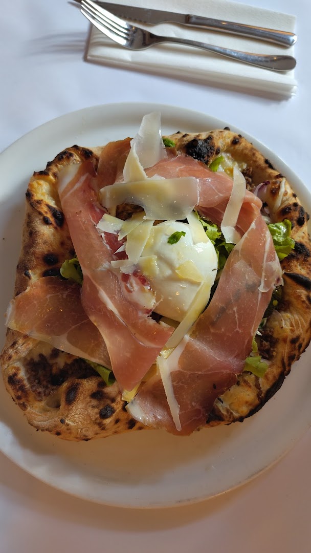Блюдо: Pizza la pugliese. Описание блюда: Sauce tomate,fiore di latte, aubergines, poivrons, roquette, breseola "bœuf sèche", burrata, Grana Padano et huile d'olive.