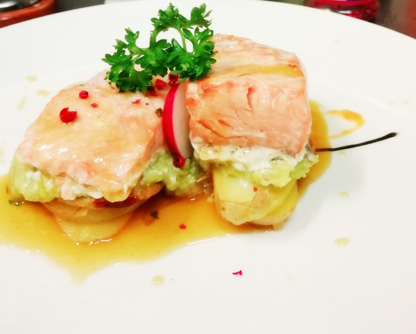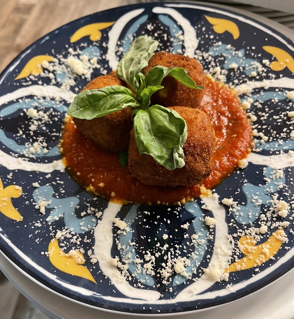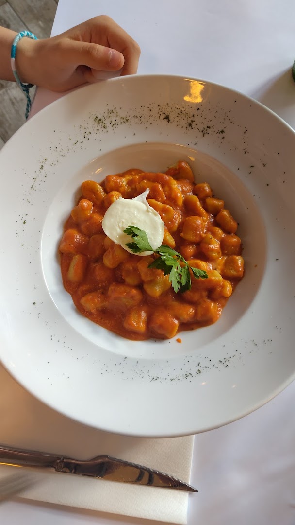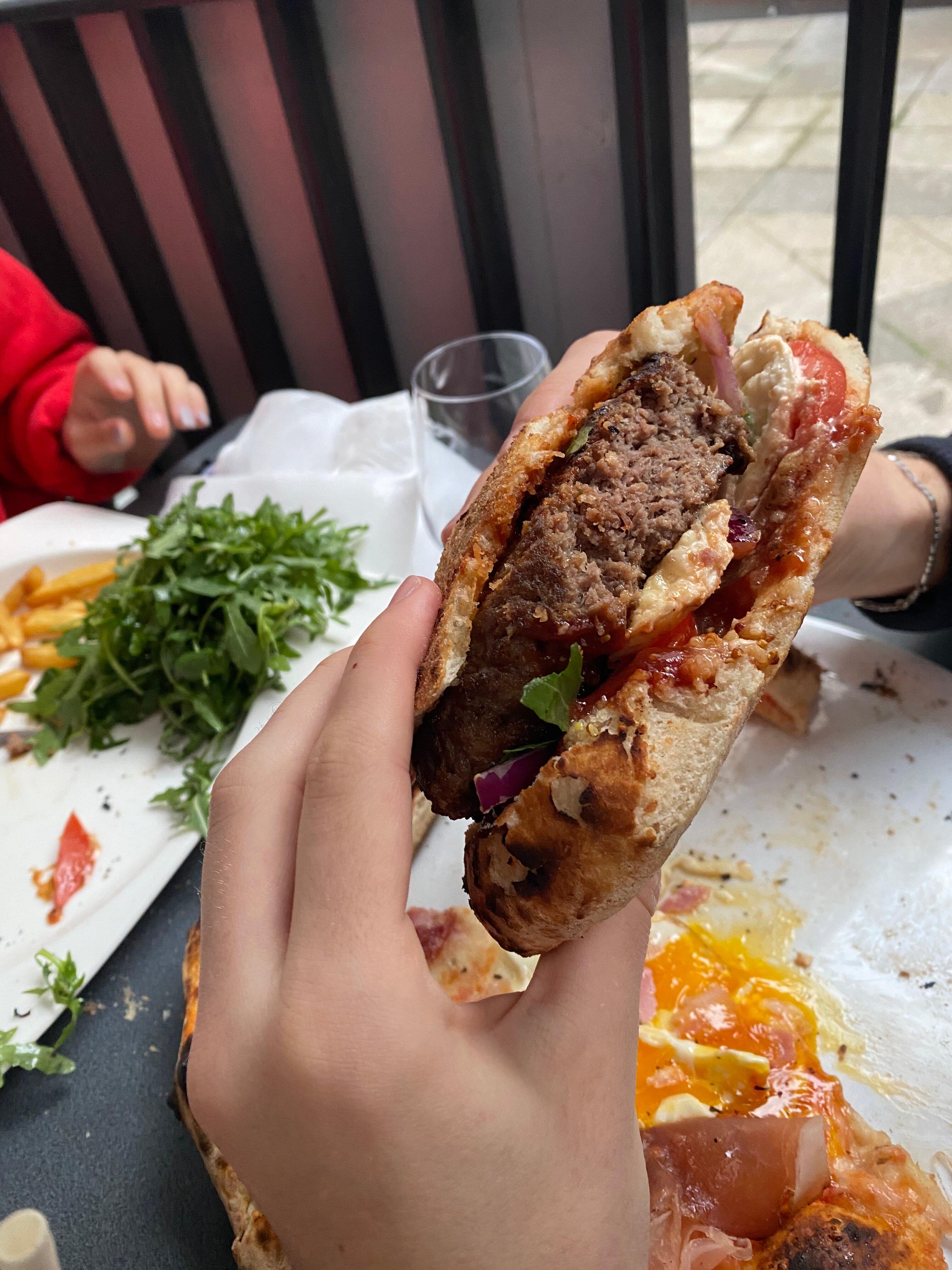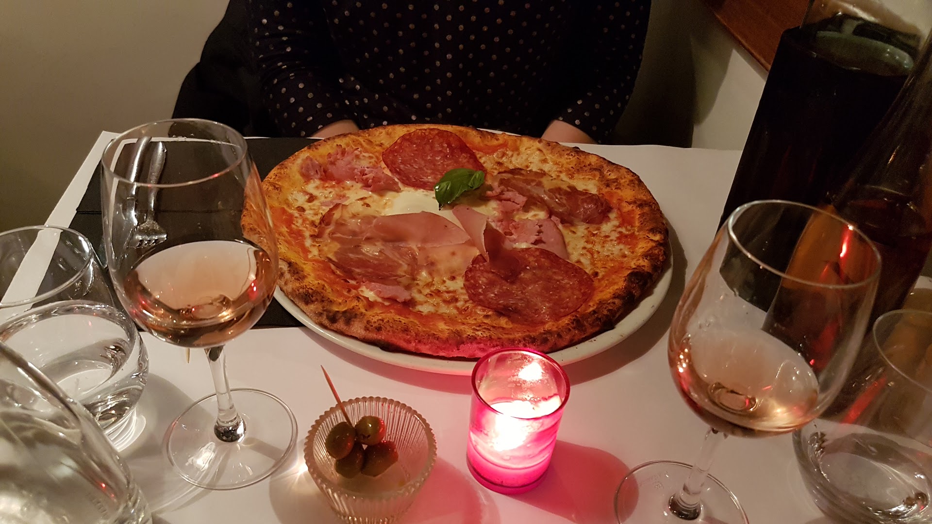 Блюдо: Pizza la pugliese. Описание блюда: Sauce tomate,fiore di latte, aubergines, poivrons, roquette, breseola "bœuf sèche", burrata, Grana Padano et huile d'olive.