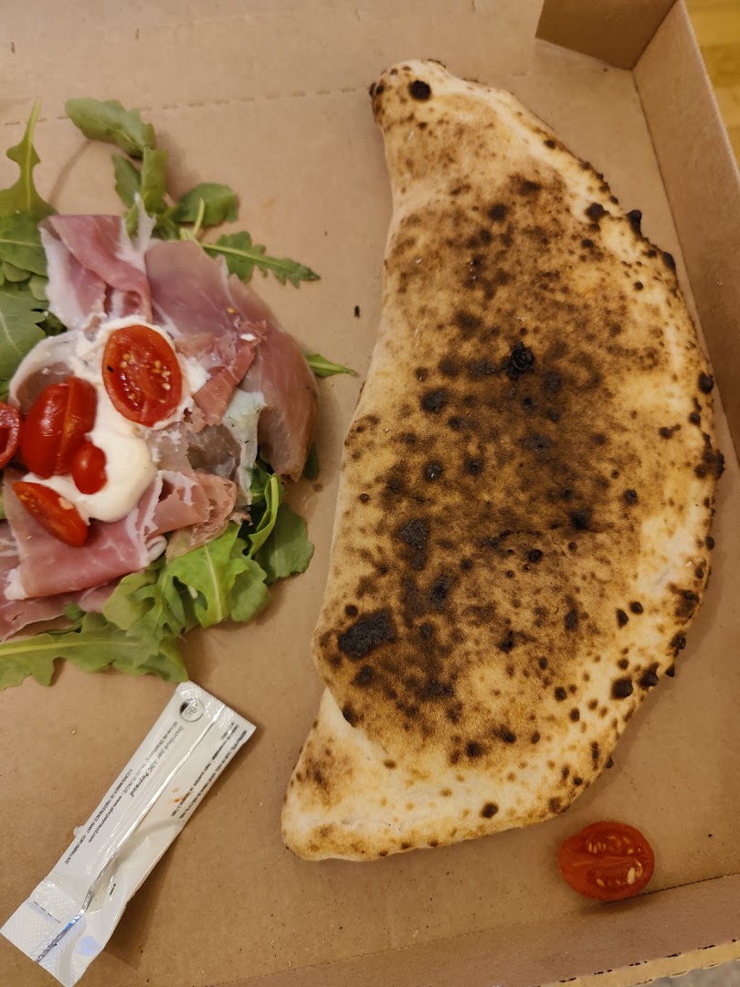 Блюдо: Pizza calzone mimmo. Описание блюда: Jambon San Danielle, roquette, Ricotta tomates cerises présenté sur une pizza fourrée à la fiore di latte et Provola affumicata.